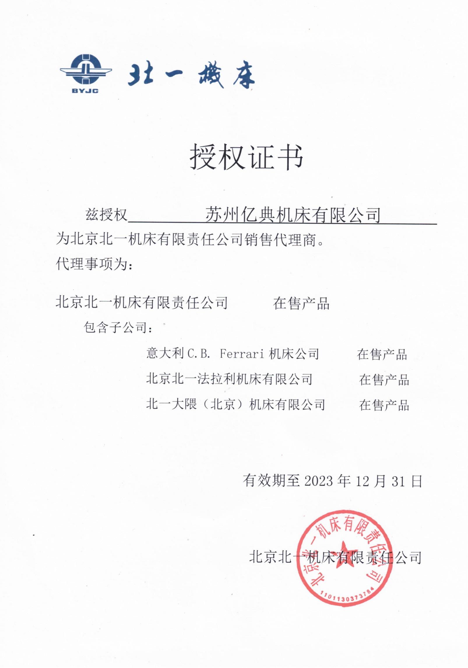 北一機床(北一大隈)授權(quán)書2023年